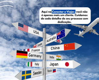 Muitos destinos internacionais exigem visto consular, e o processo pode parecer complexo. Aqui, na Conectar e Viajar, estamos prontos para ajudar você em cada etapa, tornando tudo mais fácil e rápido. Por meio de nossa parceria exclusiva com a renomada assessoria Mundo dos Vistos, garantimos um atendimento ágil, seguro e sem complicações.